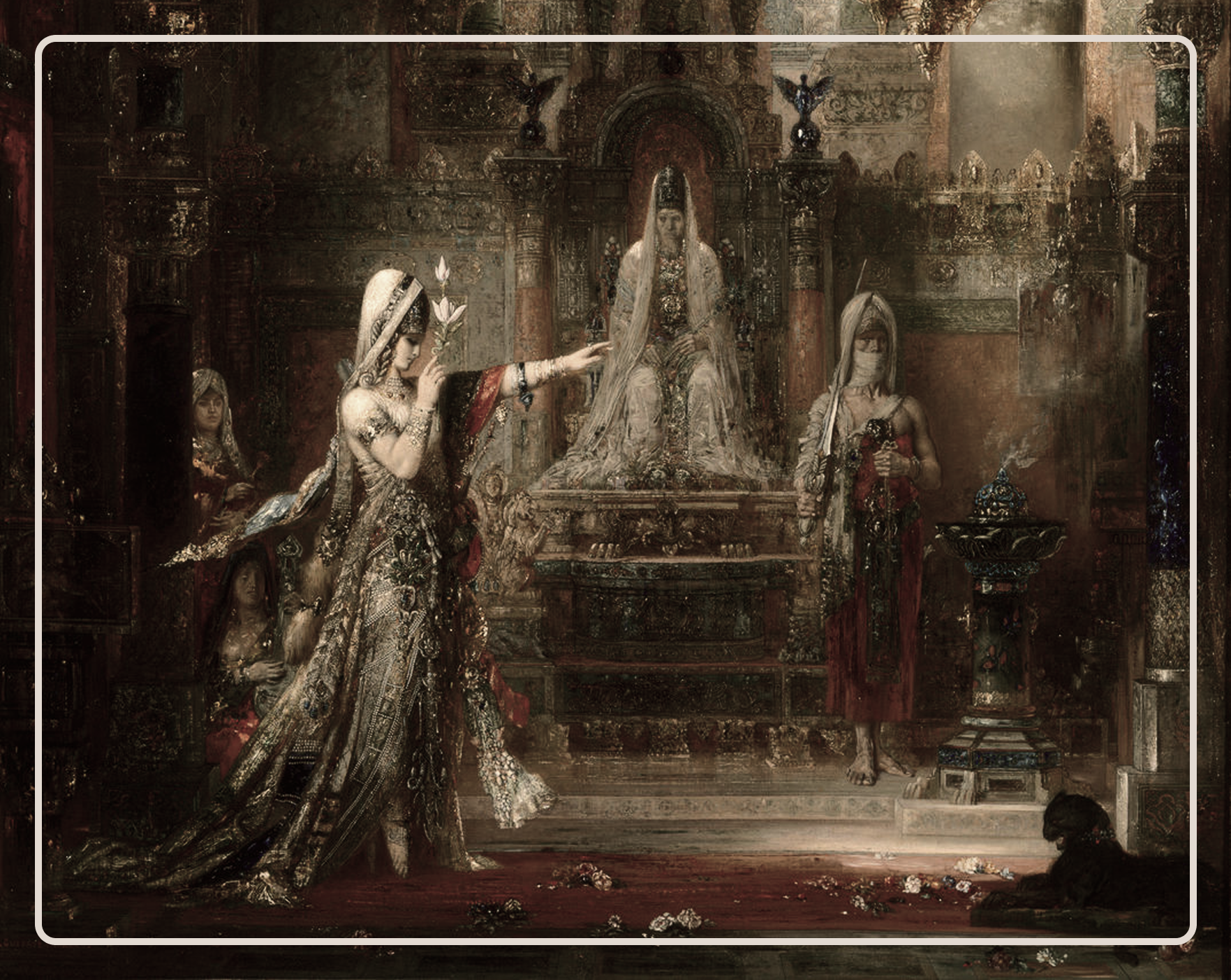 Он создает вымышленный декоративный образ Востока с его напряжением страстей, таинственными богами, вспышками света в полутьме и сиянием драгоценных камней. Саломея исполняет свой танец в помещениях, напоминающих одновременно готическую и мусульманскую храмовую архитектуру; ее одежда – финикийская, прическа сделана на манер карфагенской жрицы Саламбо из одноименного романа Г. Флобера <…> Она же выступает жрицей Великой богини: узоры на ее теле (лотос и два открытых глаза, символы чистоты, провидения и мудрости, – на груди; голова Медузы Горгоны, окруженная змеями, — на животе и бедрах) и браслет с изображением мужских голов на картинах «Татуированная Саломея» и «Саломея, танцующая перед Иродом» соответственно указывают на ее принадлежность к культу сирийской Астарты (которую в это время смешивали с фригийской Кибелой», а также – «Г. Моро изучает восточные культы и создает новую священную мифологию.